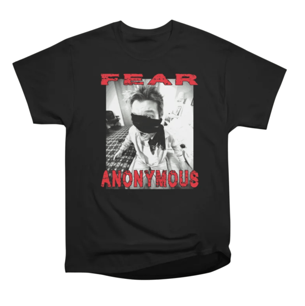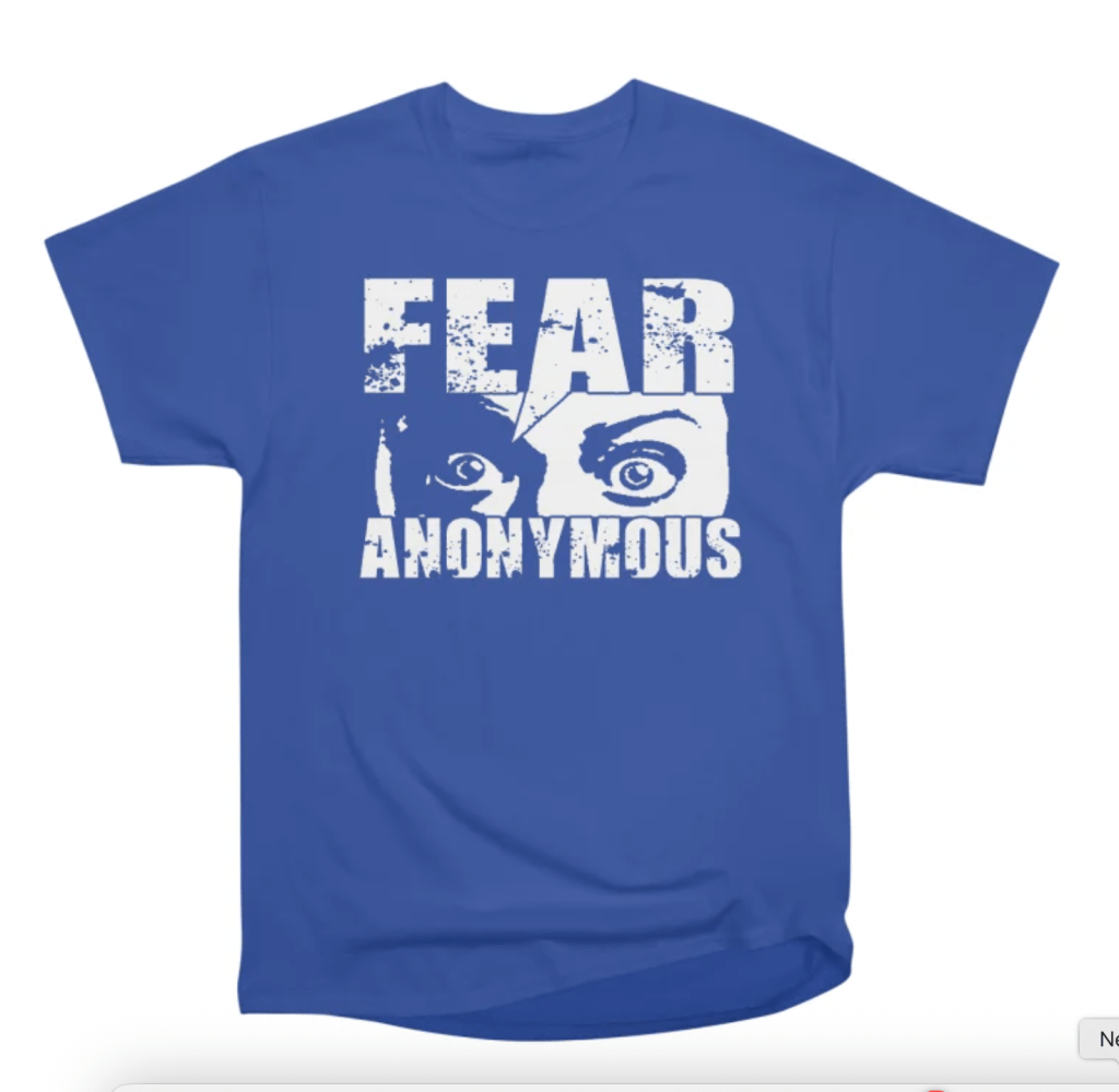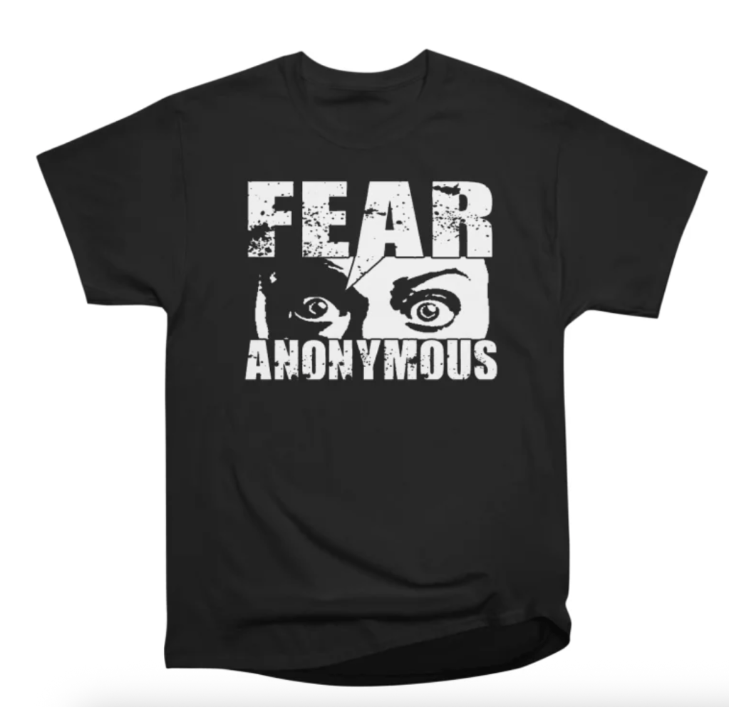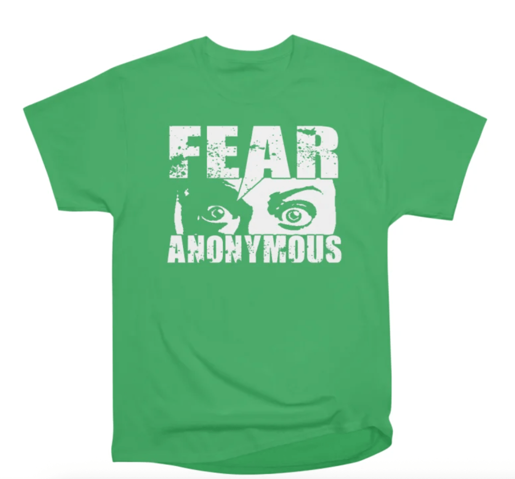 Salutations, shoppers! White Ninja Productions’ new Threadless site with four different FEAR ANONYMOUS designs is live (h/t to Lisa).