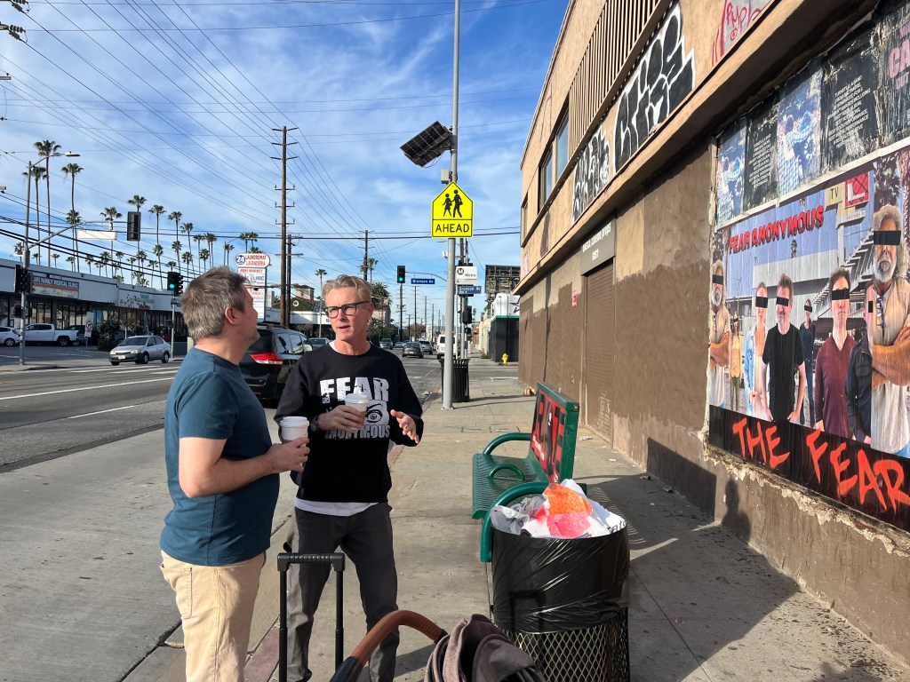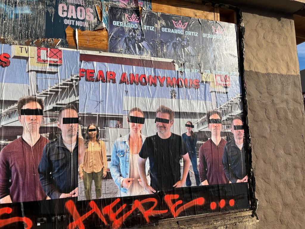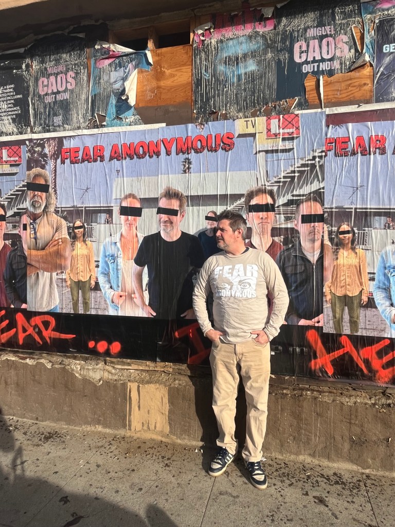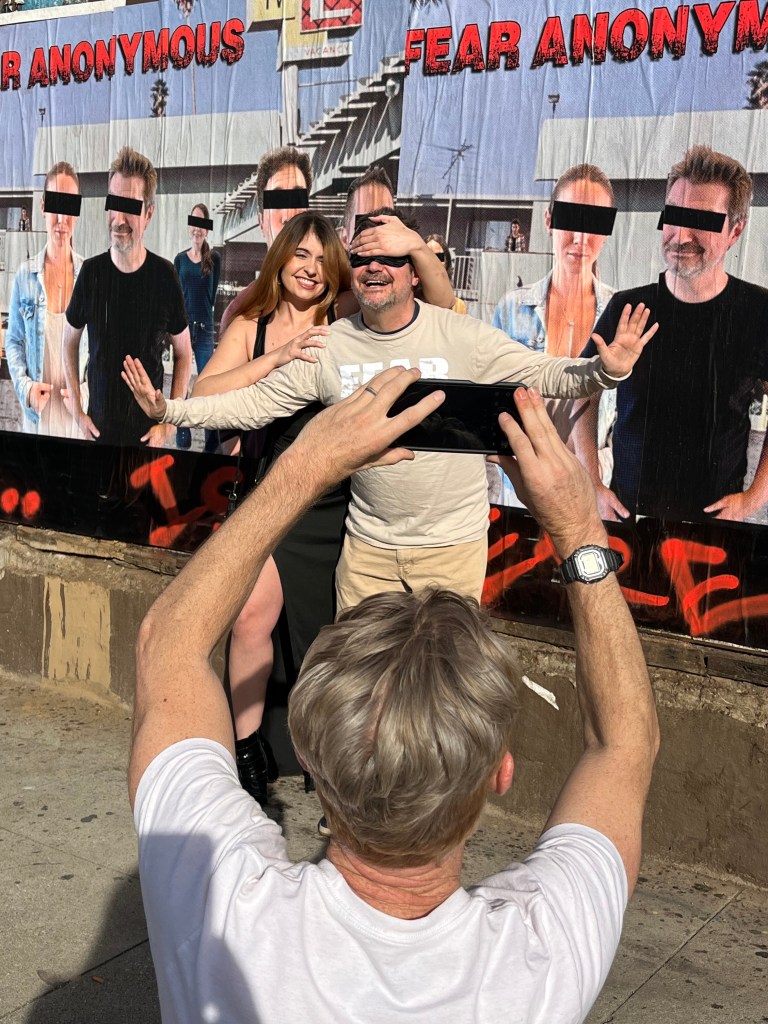 Giant posters and photo shoot on Santa Monica Blvd. in Los Angeles, 1/17/26.